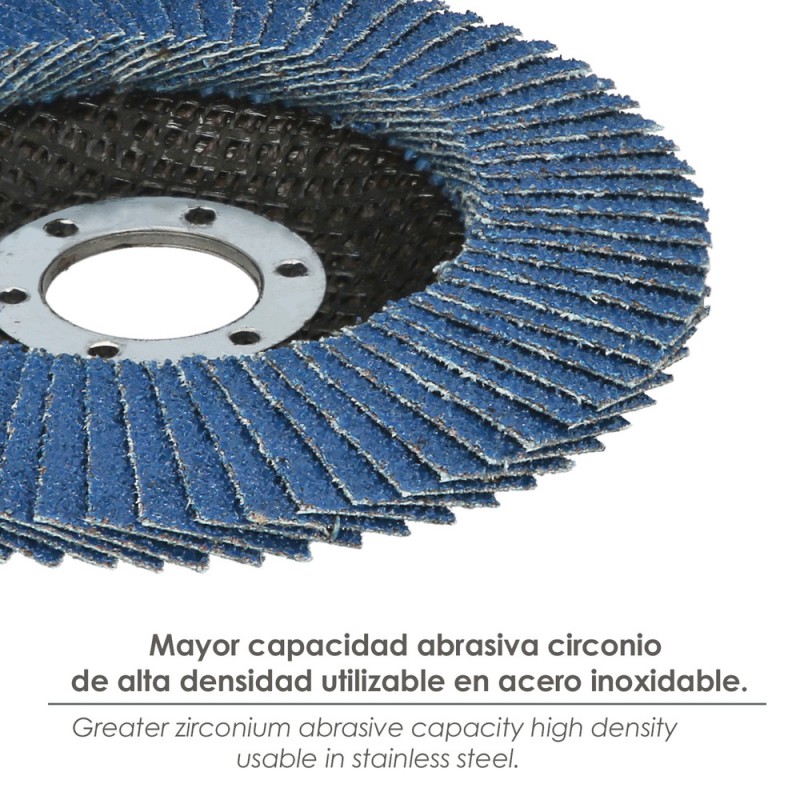 - Aletas del disco con circonio y un angulo de 10º. El circonio le aporta una duración mayor. Disco de lija para amoladora de 115 mm.
