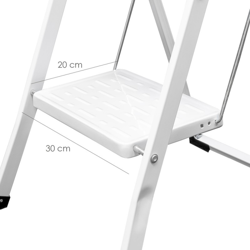 - Escalerilla fabricada en acero y color blanco, con 4 resistentes peldaños y patas de pvc antideslizantes para uso doméstico.