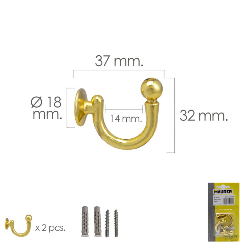 Gancho Latonado Atornillabe 37 mm. Con tacos y tornillos (Blister 2 piezas)