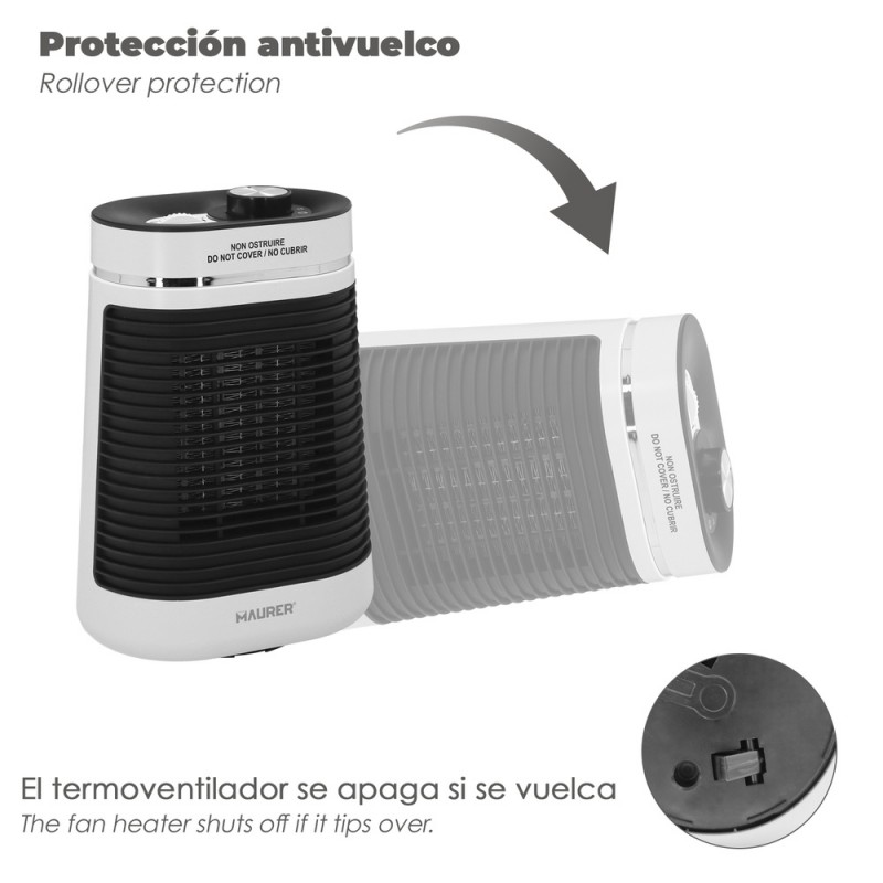 - El calefactor cuenta con un dispositivo antivuelco y con protección contra sobrecalentamiento, que apaga el aparato automáticamente en caso de caída o sobrecalentamiento.