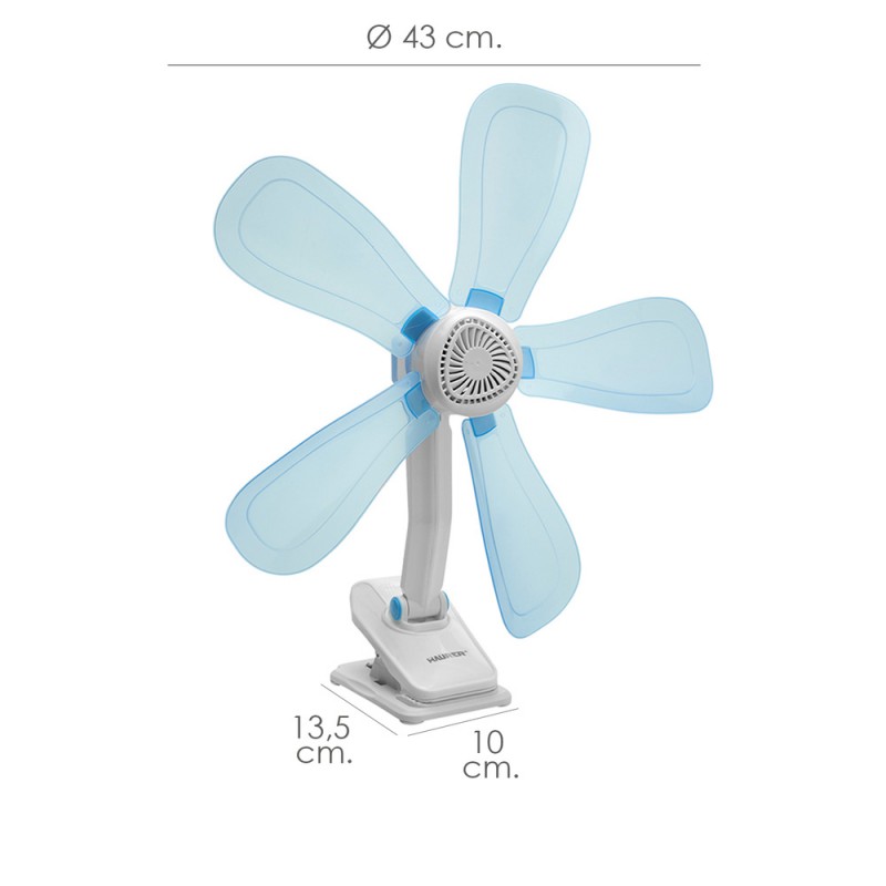 - Diametro aspas: Ø 43 cm. Medida base: 13,5x10 cm. Apertura clip: 5 cm.